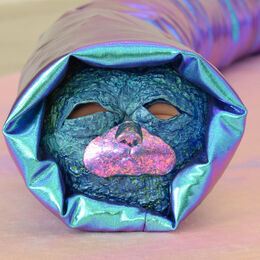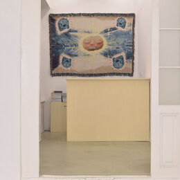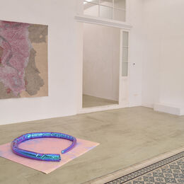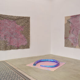 The sense of liveliness in the intricate marks in Lim’s paintings creates a new material reality for the central sculpture. A Sleeping Beauty, coiled on the floor of the gallery, abreast a soft carpet all of its own, probes its drowsy eyes from its iridescent cocoon, maybe blinking headily at the pixilated maps and drapery. Entwined in bioluminescence, A Sleeping Beauty resists zoological definition. It plays with tendencies to bestow human emotions or physical sensations to the world around us.